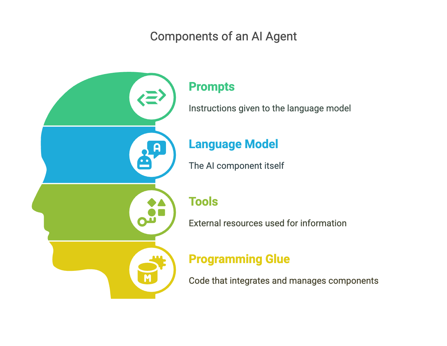 Programming Glue: code to to hold it all together, including ordinary Python variables for to give the agent temporary working memory.